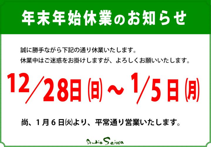 12日28(日) 〜 1月5日(月)まで、休業いたします。