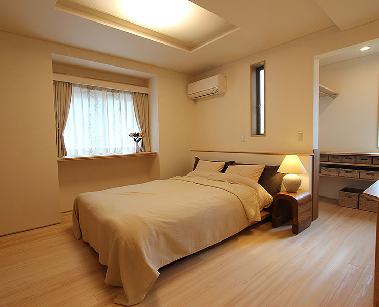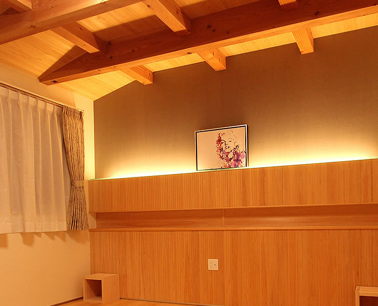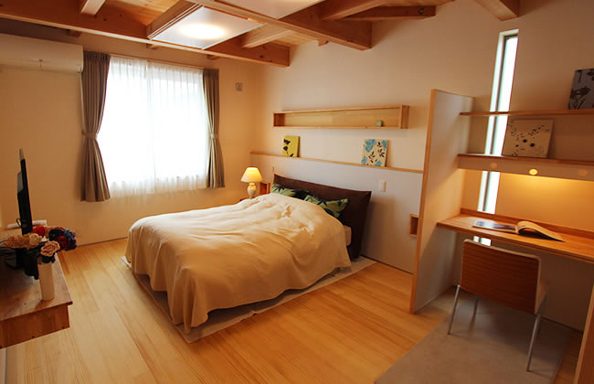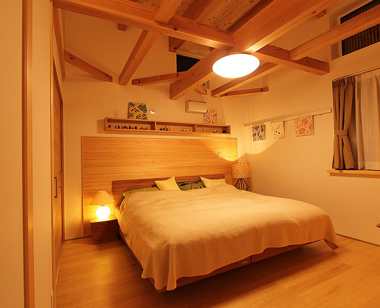 N邸では、天井や梁、桁、柱から収納棚、寝室のデスクまで無垢材を適材適所に採用。