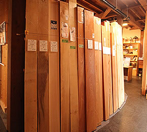 様々な樹種の無垢の展示販売を行っており、ショールームに入ると森に来ているかのような木の香りに包まれます。
