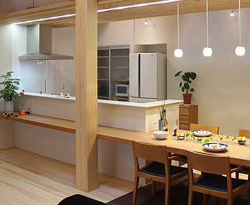「飾り棚で空間を区切りながらも家全体がつながっているので、どこにいても家族の気配を感じられる。」