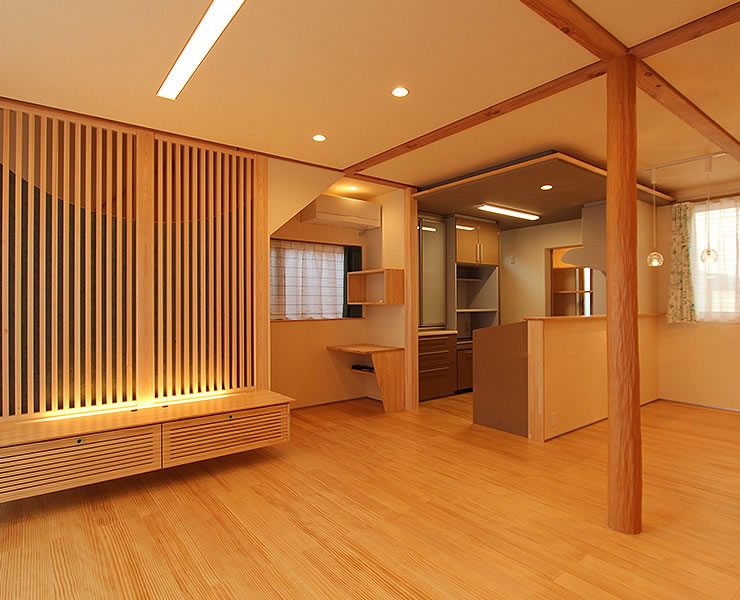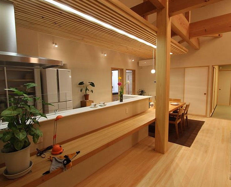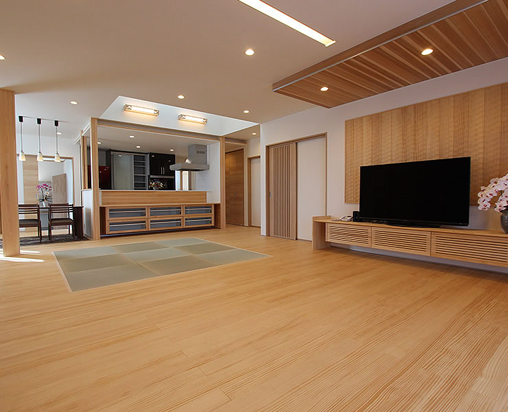 暮らして6年目。床や壁、天井の無垢材など木の温もりが感じられるLDKは、いつも子どもたちが元気に走り回って遊んでいるそう。