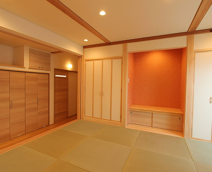 各スペースに造り付けした無垢材の収納は、家族の成長でモノが増えても常に片付いた住まいを実現しています。