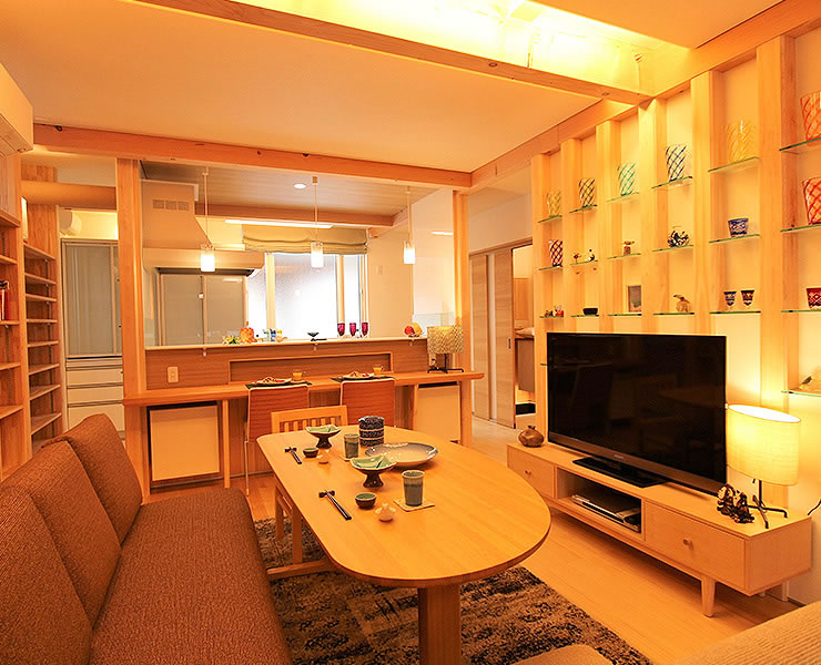 ヒノキや杉など無垢材をふんだんにあしらったリビングは、夫妻の一番のお気に入りで、1日の終わりをここでゆったりと過ごすのが至福の時とのこと。